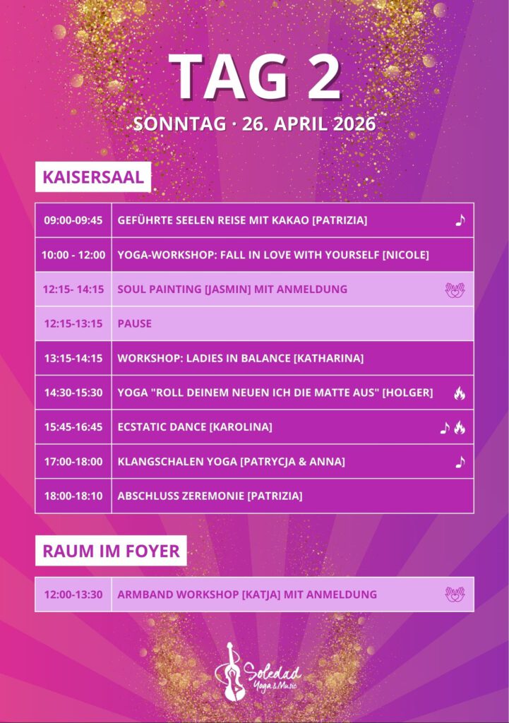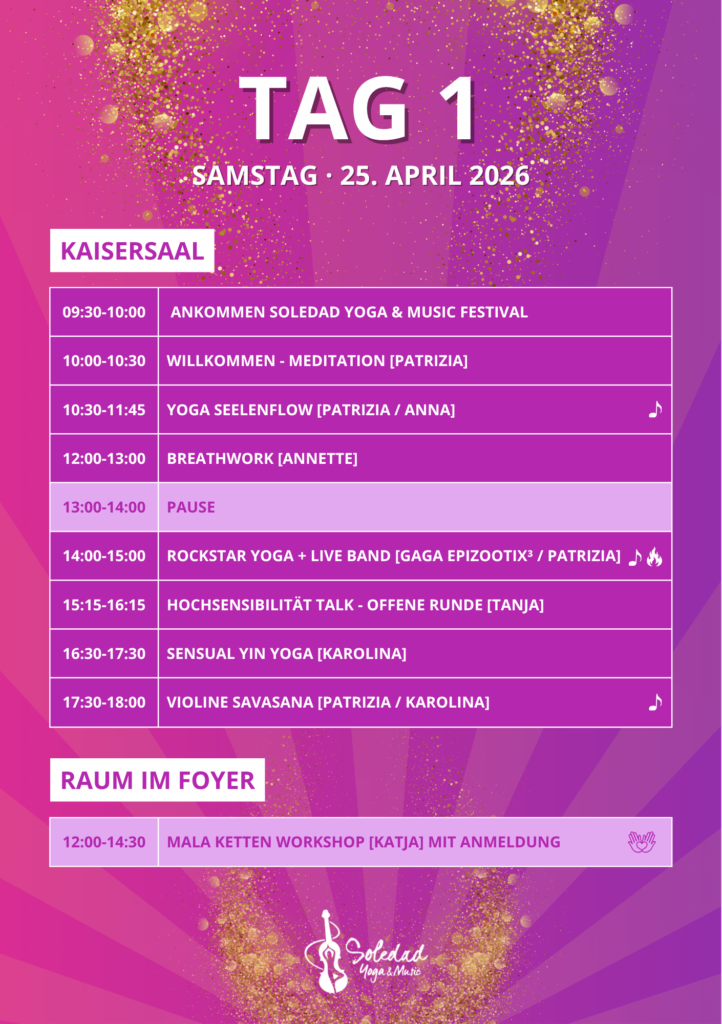Ein wundervolles Line-up aus erfahrenen Yoga-Lehrerinnen, Coaches und Seelenbegleiterinnen. Soul Painting, Breathwork, Spiritual Life Coaching, heilsame Musik, Workshops, ein liebevoll gestalteter Marktplatz – und die Möglichkeit, deine eigene Mala oder dein eigenes Armband zu kreieren. All das eingebettet in die Ruhe und Weite des Landes, fern vom Trubel der Stadt – ein Ort, an dem du durchatmen, ankommen und auftanken darfst.